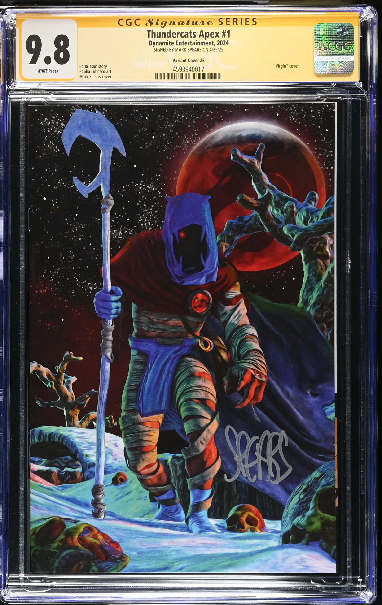 Limited 1 for 15 Retailer Incentive Variant Cover. Written by Ed Brisson. Art by Rapha Lobosco. Cover by Mark Spears. Across a desert landscape, a cloaked rider emerges from the shimmering heat. A lone figure on a battered mount, he’s a tempting target for bandits – and temptation is not something that the inhabitants of these badlands are inclined to resist. Unfortunately for the miscreants who decide to waylay him, that choice will likely be the last one they ever make. And when the dusty traveler walks into the local saloon, it soon becomes clear that anyone who stands between him and his mission will share the same fate. But who is this mysterious stranger – and what is the target that he has fixed his glowing red eye upon? Featuring otherworldly covers from DECLAN SHALVEY, LUCIO PARRILLO, MEGHAN HETRICK, and JAE LEE & JUNE CHUNG, this historic 40-page special from renowned writer ED BRISSON (Batman Incorporated, Uncanny X-Men) and acclaimed artist RAPHA LOBOSCO (James Bond: 007) answers the most burning question on all of Third Earth – who is Apex? – and sets the stage for the dramatic new story arc launching in ThunderCats #11! 40 pages, full color. Rated T Cover price $4.99.